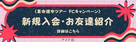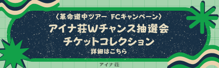 2025.09.26 【会場限定】ワンマンツアー「革命道中」アイナ荘Wチャンス抽選会とチケットコレクション&新規入会・お友達紹介キャンペーン実施決定! 10月1日(水)から全国9都市を巡るワンマンツアー「革命道中」の各会場でアイナ荘Wチャンス抽選会&新規入会・お友達紹介キャンペーンの実施が決定いたしました! このチャンスお見逃しなく!✨ 🏠アイナ荘Wチャンス抽選会とチケットコレクションの詳細は下記バナーをクリック 🏠新規入会・お友達紹介キャンペーンの詳細は下記バナーをクリック ご来場の際は、是非ファンクラブブースまでお立ち寄りください🌹